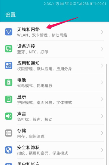 2、在设置页面下,我们需要找到“无线和网络”,然后点击“无线和网络”进入到对应的设置页面中,如下图: