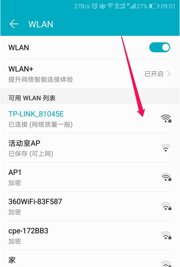 4、进入到“WLAN”条目中,我们可以在“可用WLAN列表”中发现周围的wifi,第一个wifi就是我们已经连接的wifi,我们点击一下已经连接的wifi,如下图: