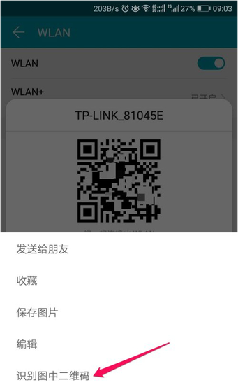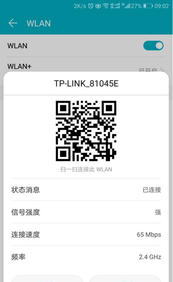 5、手机会弹出wifi的一些基础信息,还包括一个二维码,这个二维码中就包含着wifi的名称以及密码这些信息,这个时候我们将这个页面进行截屏,如下图: