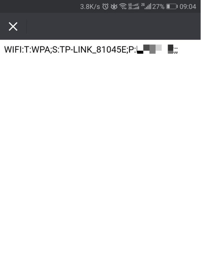 8、微信会识别出二维码中的信息,在这段信息中,“WIFI:T:”后面的信息是wifi的加密方式,“S:”后面的信息是wifi的名称,“P:”后面的信息就是我们需要的wifi的密码了,注意在信息最后会有两个“;;”这两个分号不是密码中的,而是这条信息固有的。